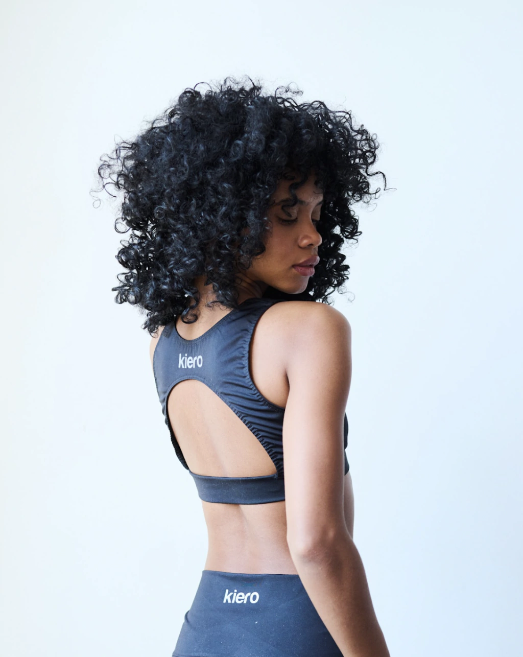Corpiño deportivo con escote redondo y recorte en espalda.